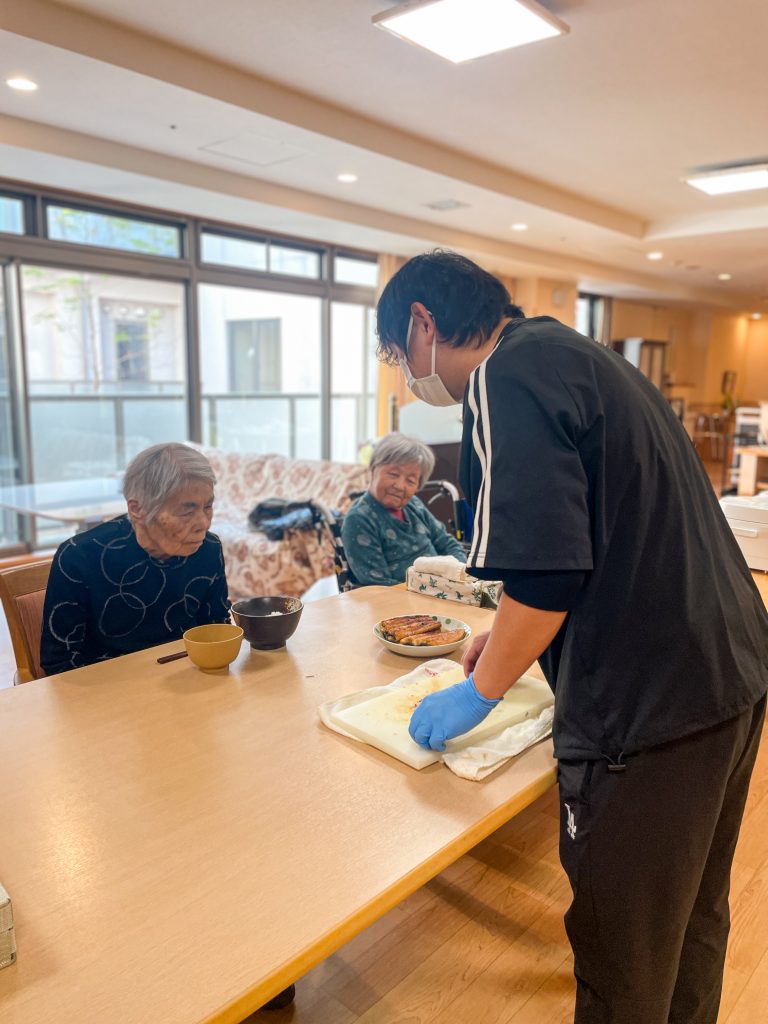 第二部では、前回と同様に各ユニットへ足を運んでいただき、入居者様と一緒にお食事を楽しんでいただきました。この日は全ユニットでユニット調理を行い、各ユニットで母国料理のミャンマー料理、冬にぴったりのお鍋、お祝いに相応しいうなぎなどを振る舞いました。職員とご家族様がゆっくりとお話しすることができ、日々のご様子や暮らしの中での変化などを共有する、和やかなひとときとなりました。